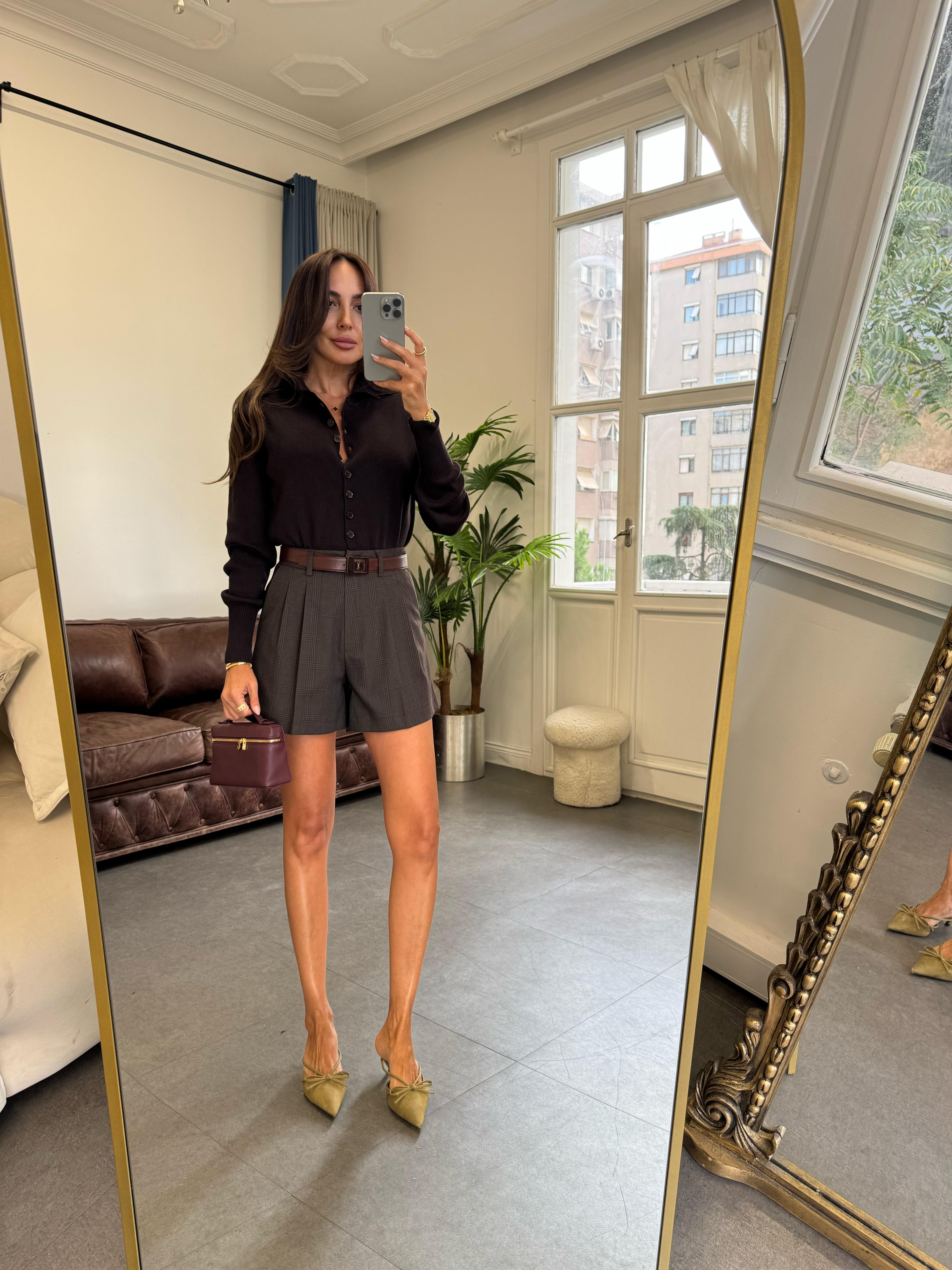 Kahve Pilili Yüksek Bel Şort (Ş0RT021)