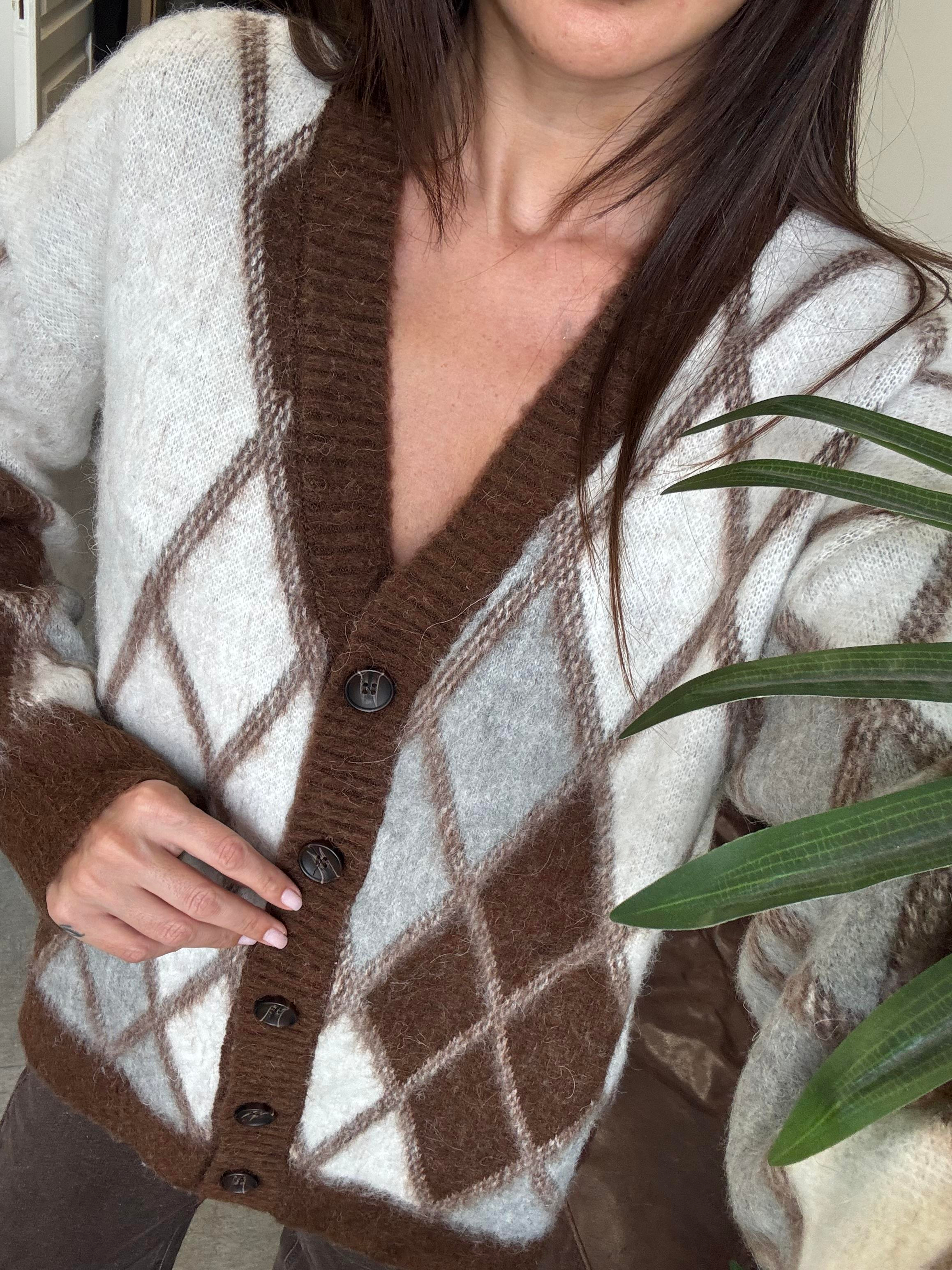 Kahve V Yaka Baklava Desenli Şardonlu Triko Hırka