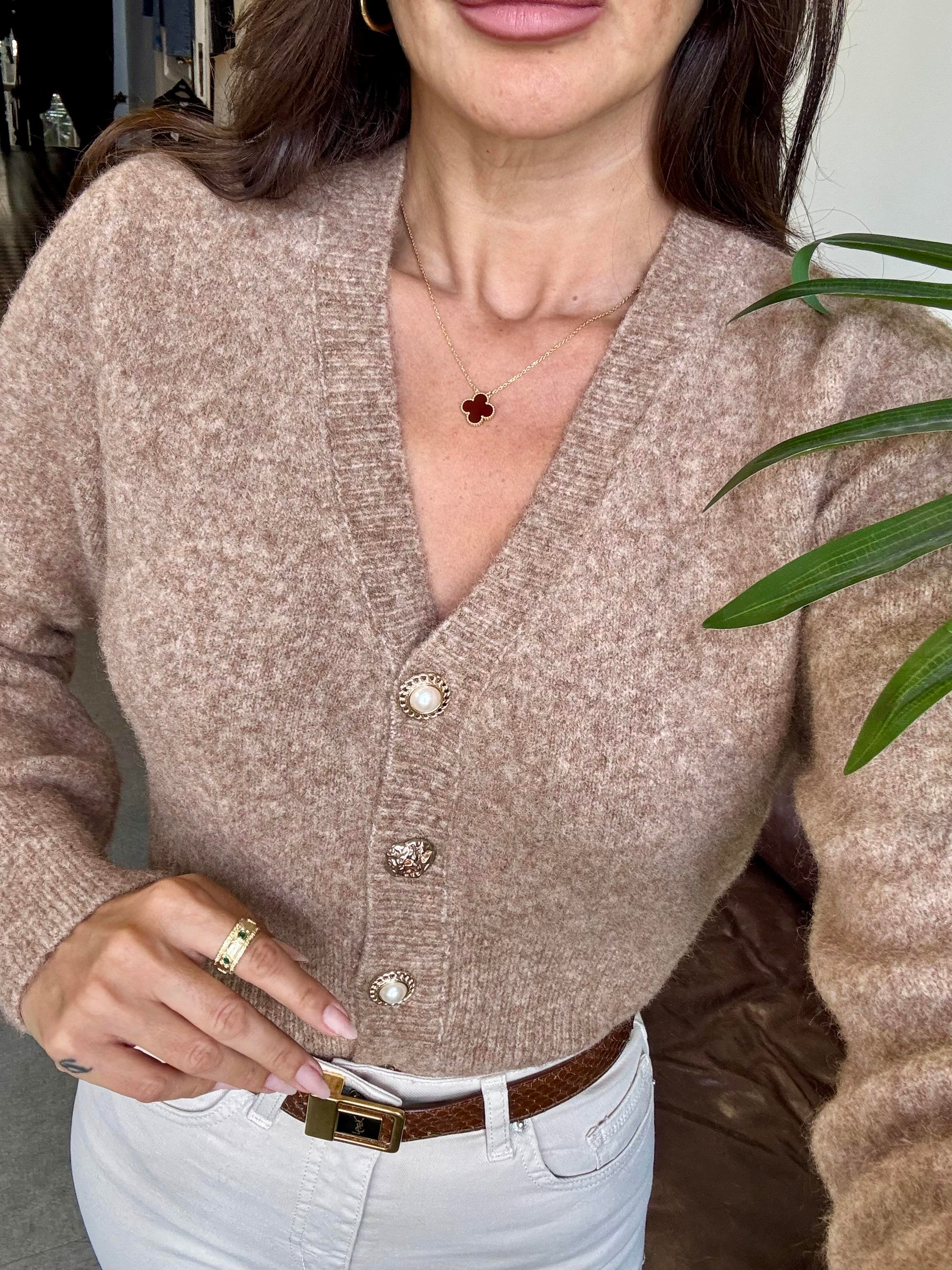 Koyu Bej Melanj V Yaka Düğmeli Triko Hırka