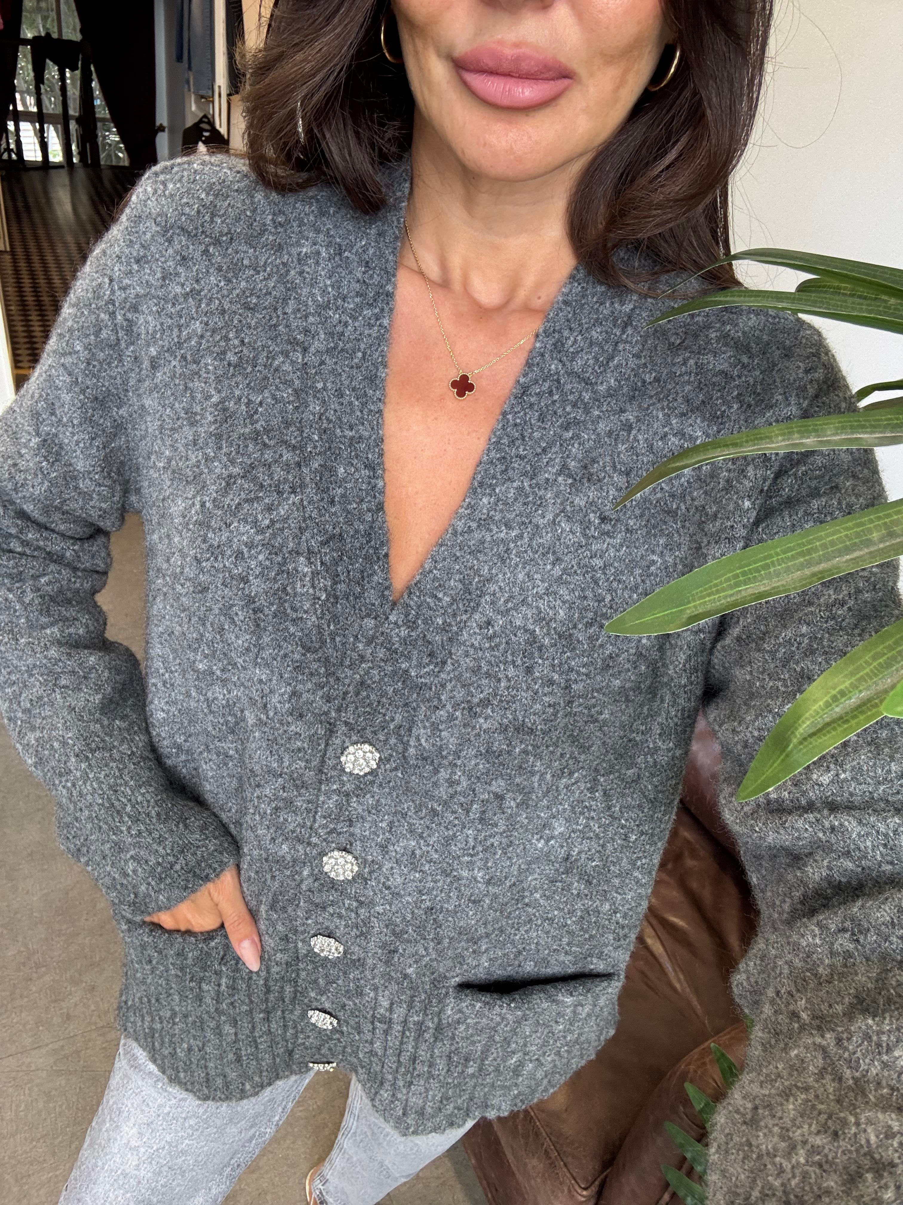 Koyu Füme Melanj V Yaka Taş Düğmeli Cepli Yumuşak Dokulu Hırka