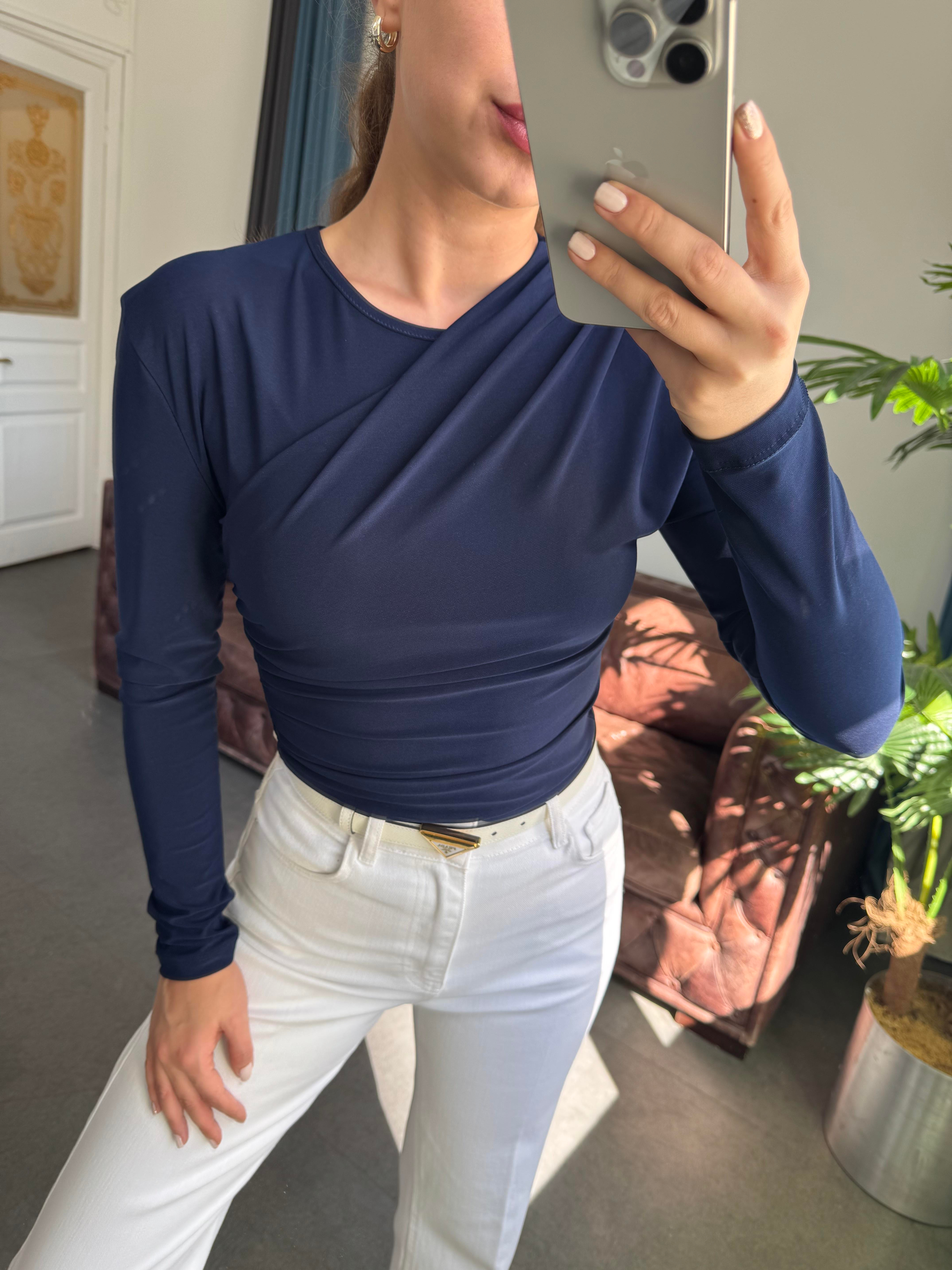 Lacivert Sandy Yan Büzgülü Bluz (BLUZ226)