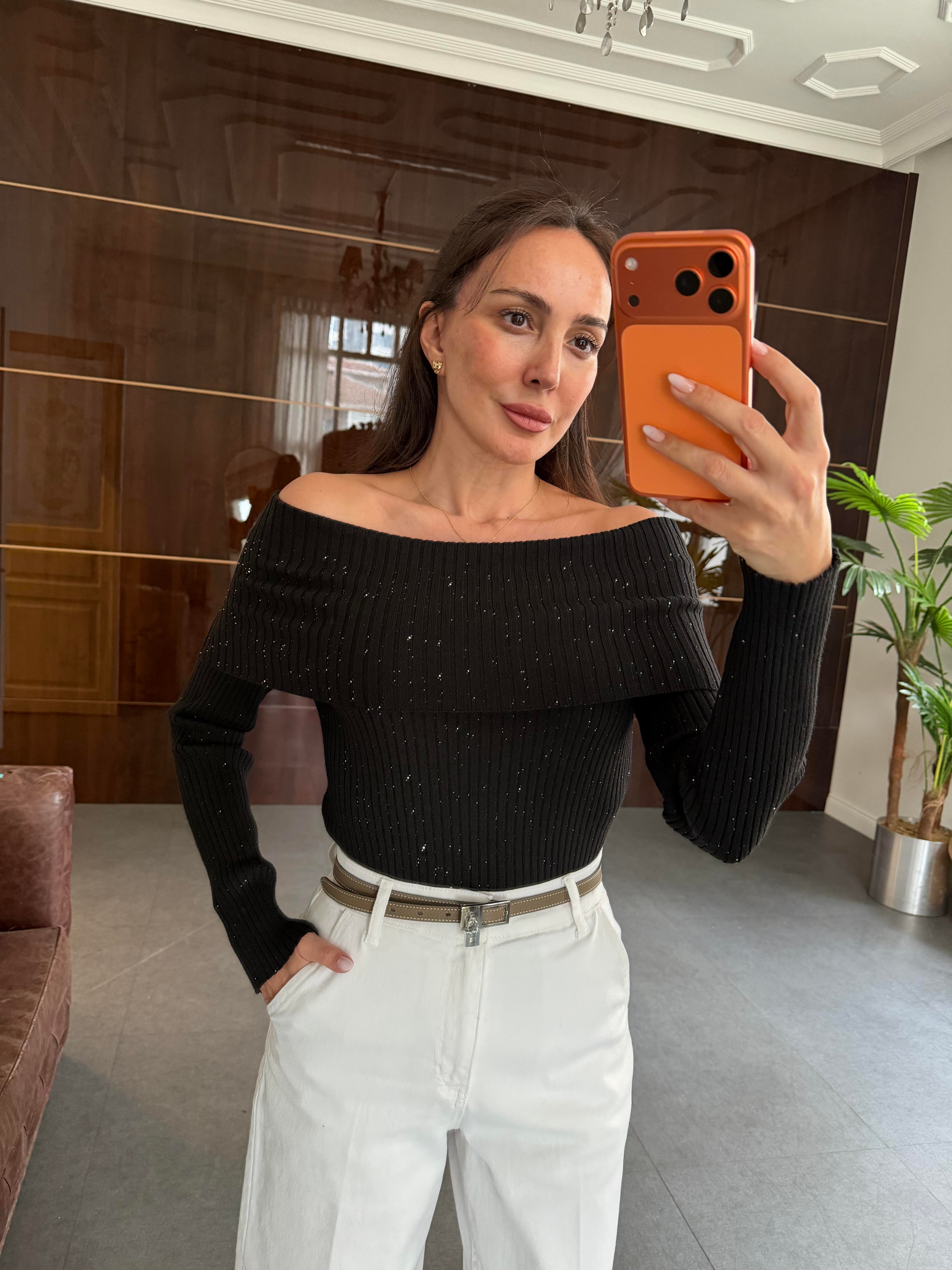 Siyah Bardot Yaka Pullu Fitilli Triko Kazak (KAZK153)