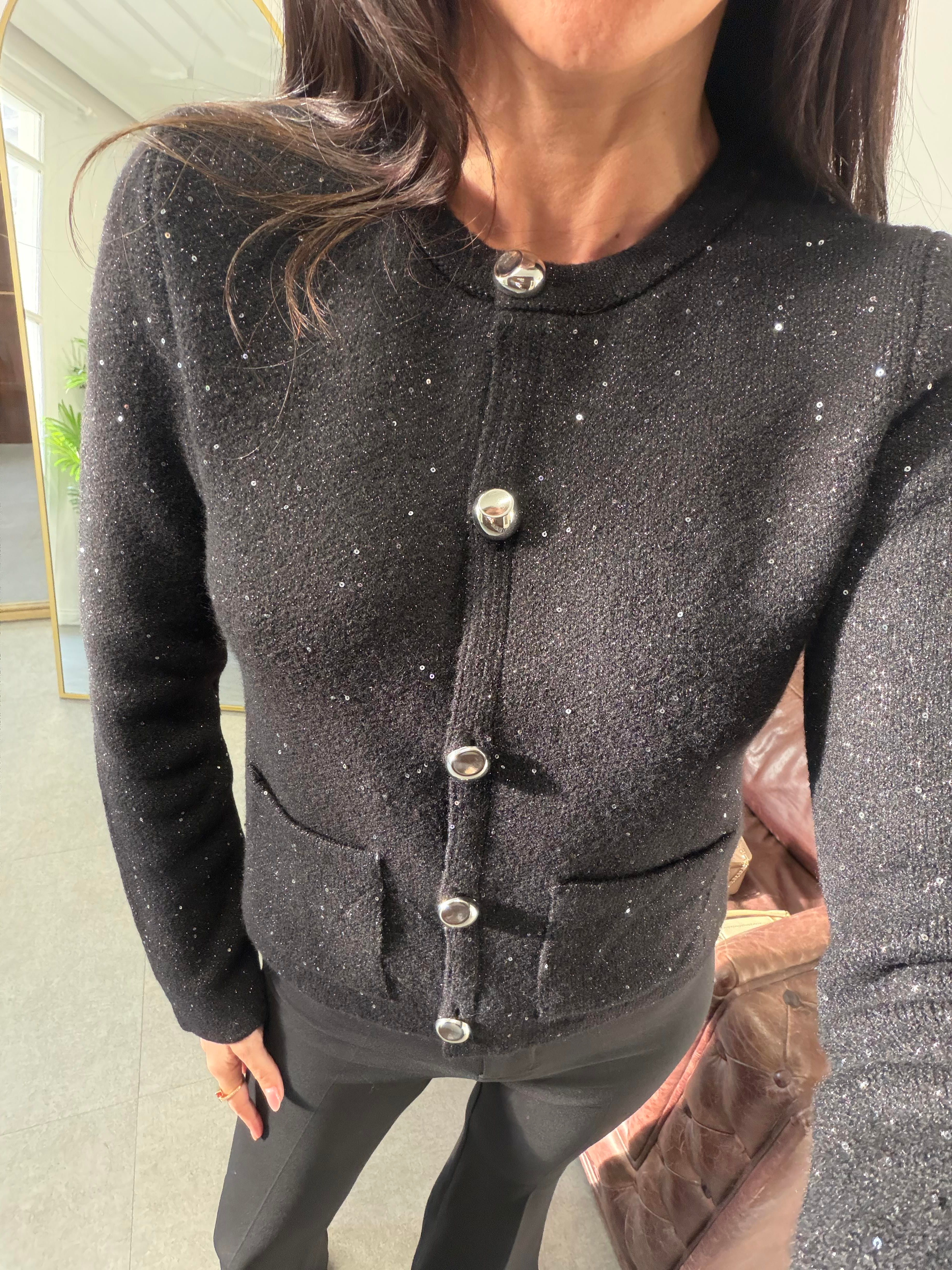 Siyah Bisiklet Yaka Pullu Simli Düğmeli Triko Hırka