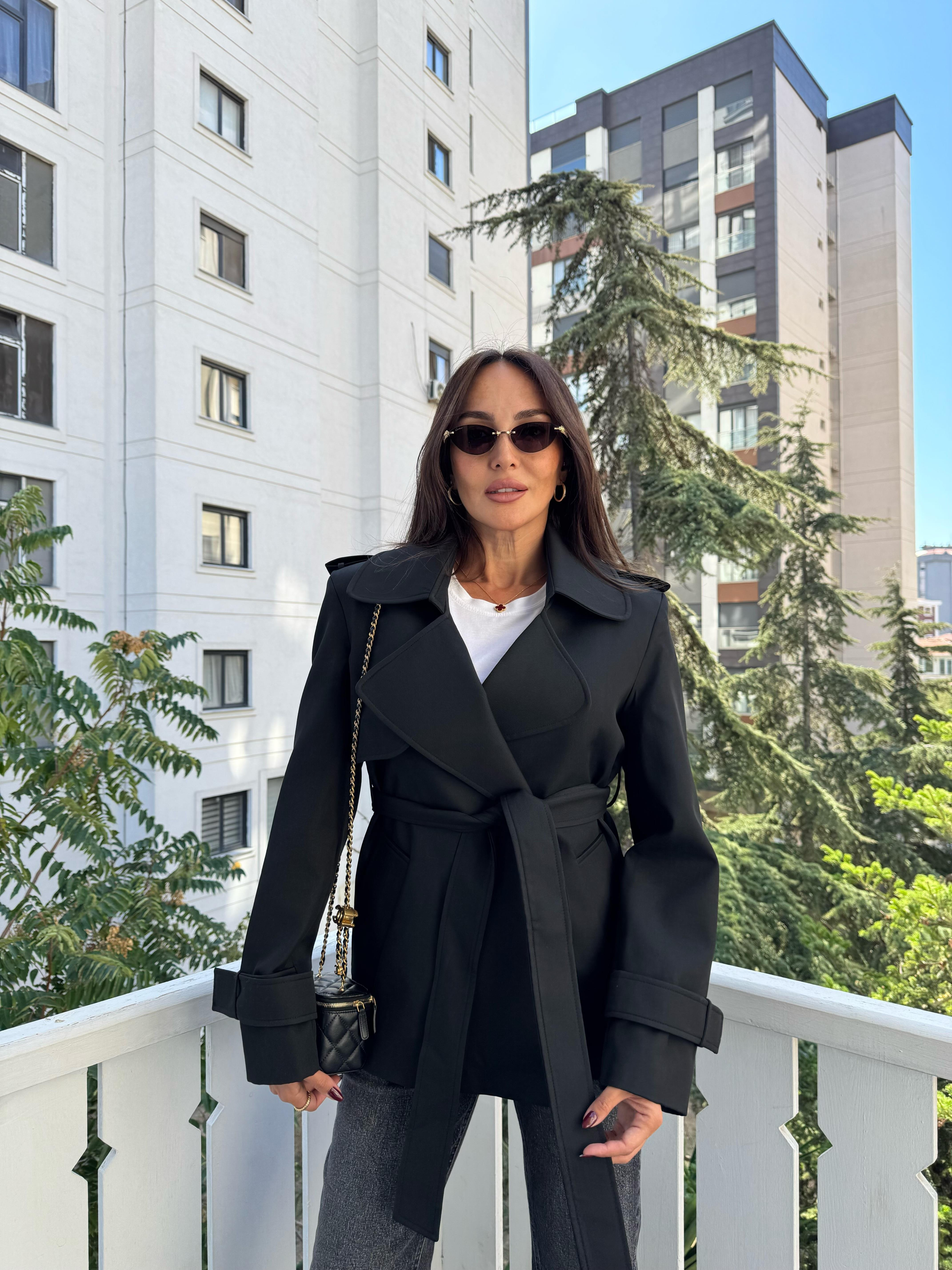 Siyah Kemerli Kruvaze Yaka Ceket (CEKT086)