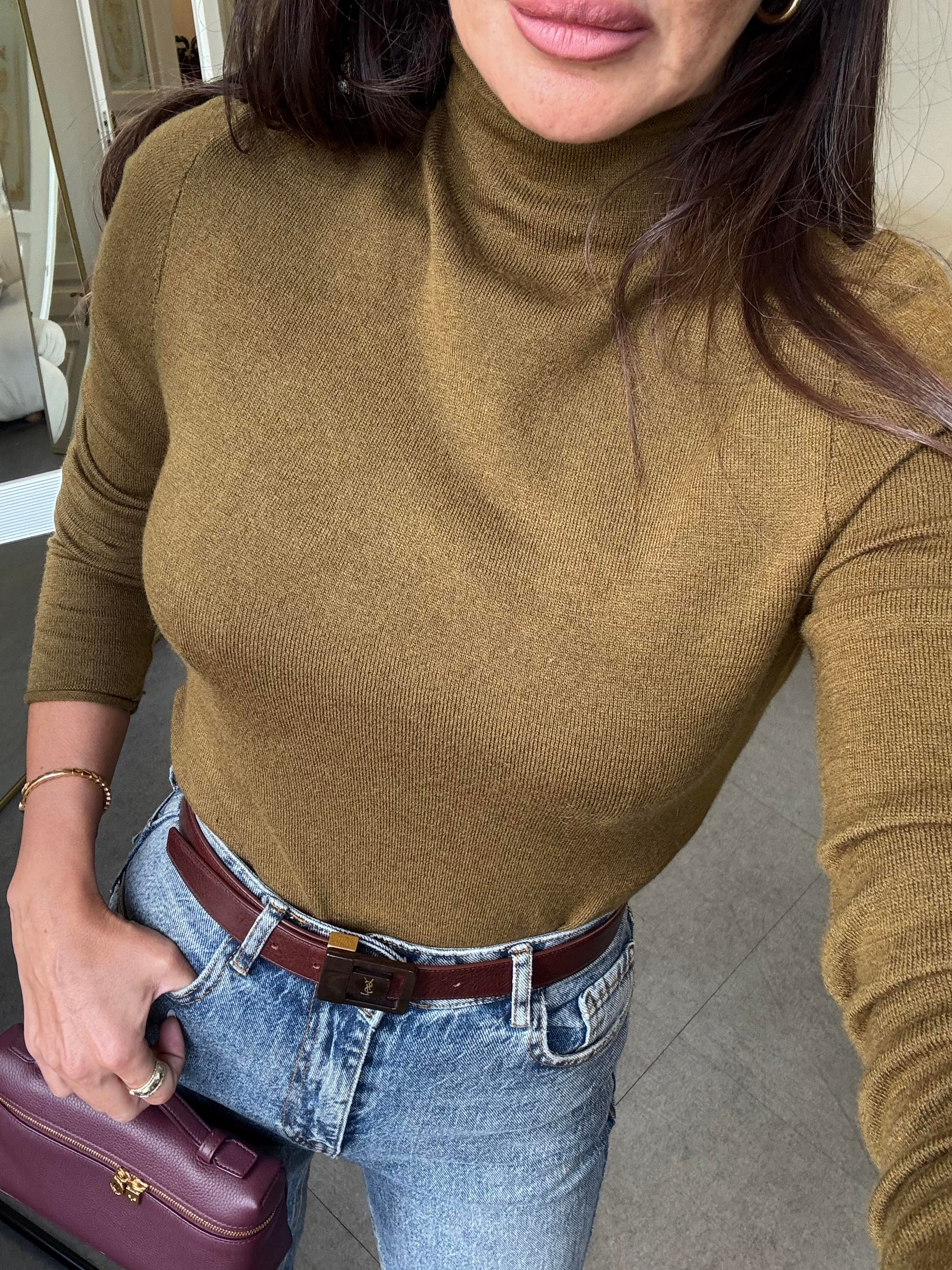 Yağ Yeşili Dik Yaka Yünlü Yumuşak İnce Dokulu Triko Kazak